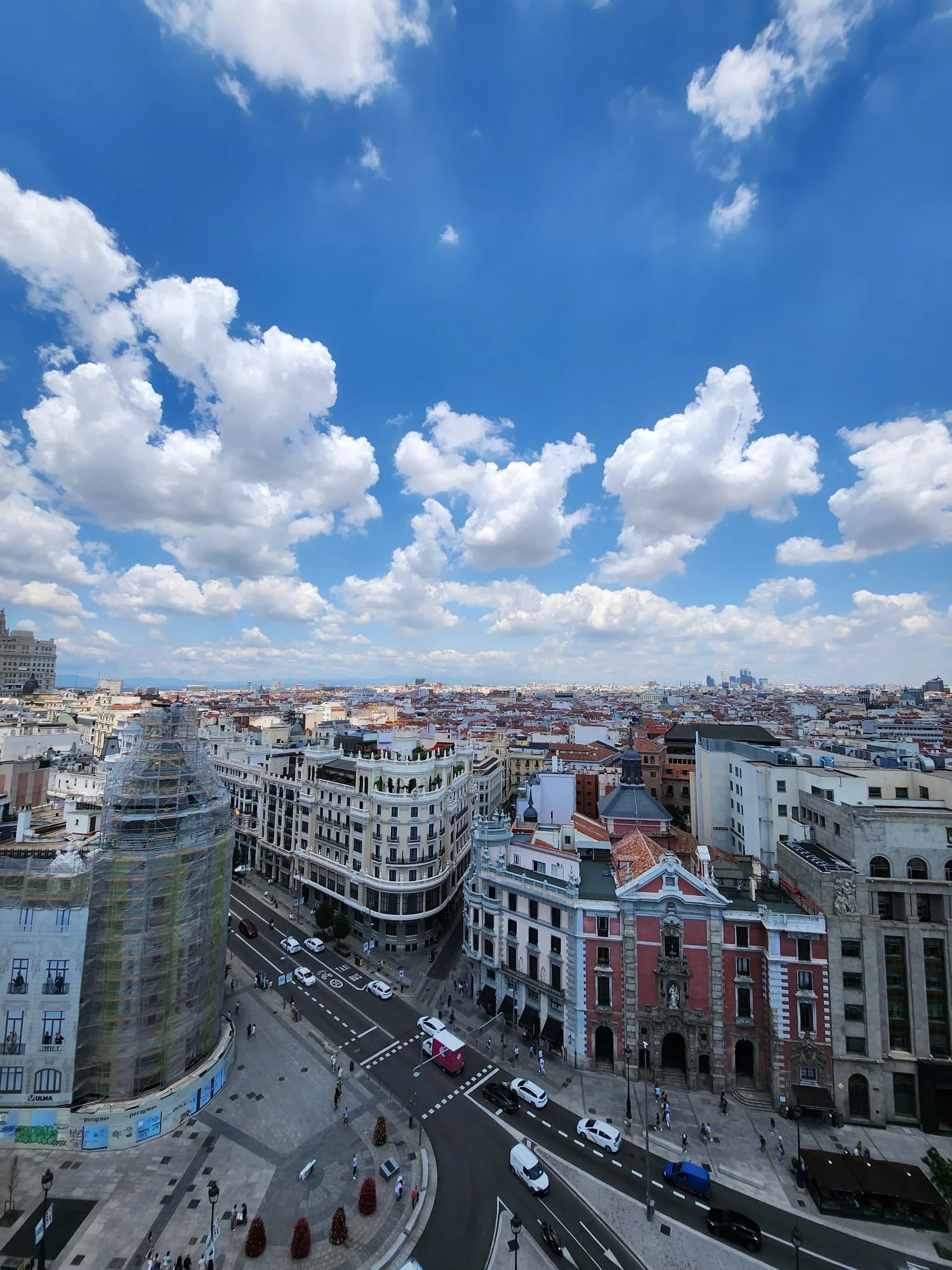 Muy cerca del Círculo de Bellas Artes hay otra azotea que merece la pena visitar si quieres disfrutar de las hermosas puestas de sol de Madrid. Se encuentra en el edificio Centro Centro, en la Plaza de Cibeles. Este edificio es actualmente propiedad del Ayuntamiento de Madrid. En su interior, hay... muchas exposiciones de arte y proyecciones de cine al aire libre En verano (bajo una cúpula de cristal y con auriculares para escuchar las películas, ¡qué curioso!). En la planta superior, hay una terraza-mirador con una vista panorámica de 360º. Desde allí se pueden ver muchos de los edificios más emblemáticos de Madrid, y el propio mirador proporciona mapas con... Los nombres y breves historias de estos lugares. 🙌 Sin embargo, los pases sólo duran 30 minutos y hay que pagar una tarifa de entrada de 3 euros para entrar.